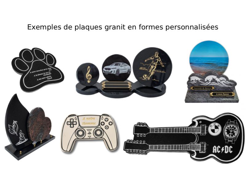 À partir d'éléments que vous nous envoyez (dessins, photos, captures d'écran etc...) nous pouvons créer des formes de plaques en granit ou plexi à la demande.