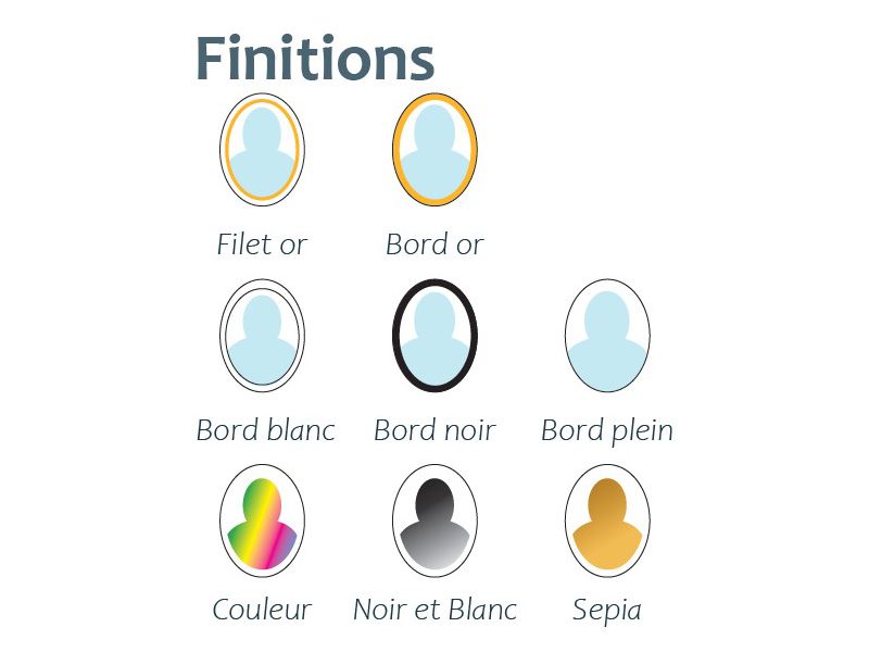 En noir et blanc, sépia ou en couleur, de forme ovale, rectangulaire, carrée ou en cœur, toutes disponibles en différents formats, elles vous permettront de choisir la meilleure manière de rendre hommage.